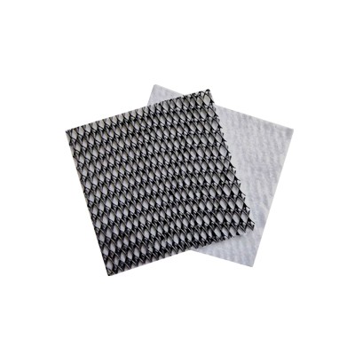 复合排水网是一种新型的排水土工材料。以高密度聚乙烯(HDPE)为原料,经特殊的挤出成型工艺加工而成,具有三层特殊结构。中间筋条刚性大,纵向排列,形成排水通道,上下交叉排列的筋条形成支撑防止土工布嵌入排水通道,即使在很高的荷载下也能保持很高的排水性能。双面粘接渗水土工布复合使用,具有“反滤--排水--透气--保护”综合性能,是目前最理想的排水材料。